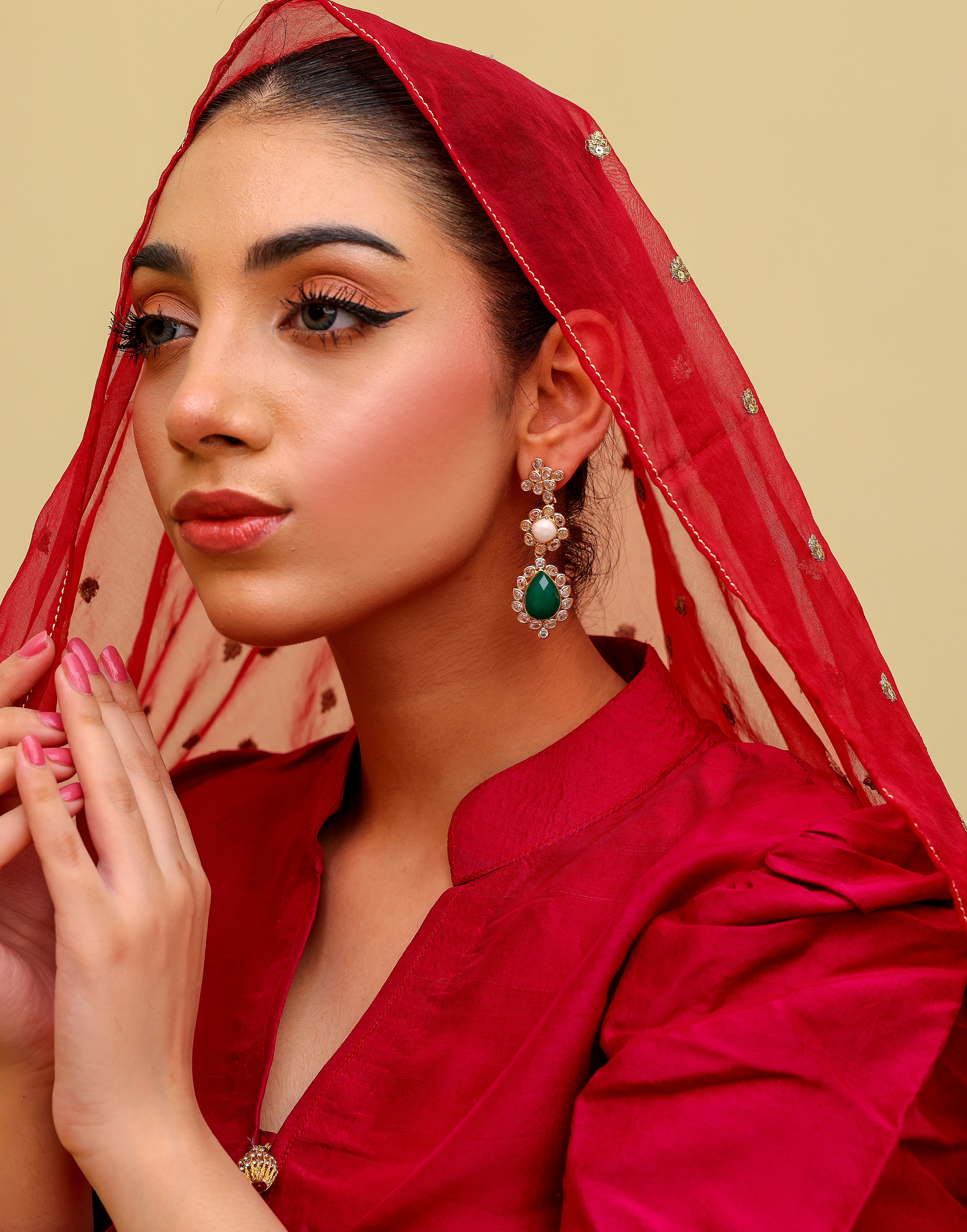 The graceful drop design, highlighted with sparkling accents, blends rich earthy tones with vibrant pops of color—perfect for elevating both traditional and modern outfits. Whether you’re attending a wedding, festive gathering, or an evening celebration, these earrings add instant sophistication and regal appeal.
